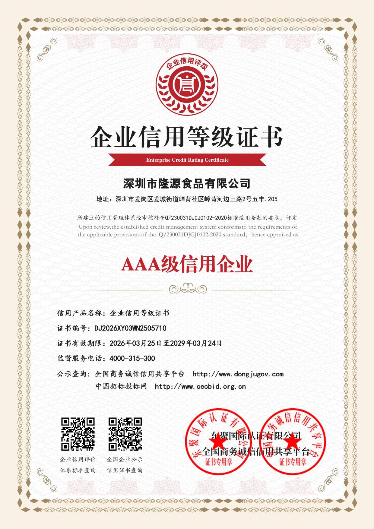 深圳市隆源食品有限公司-信用档案